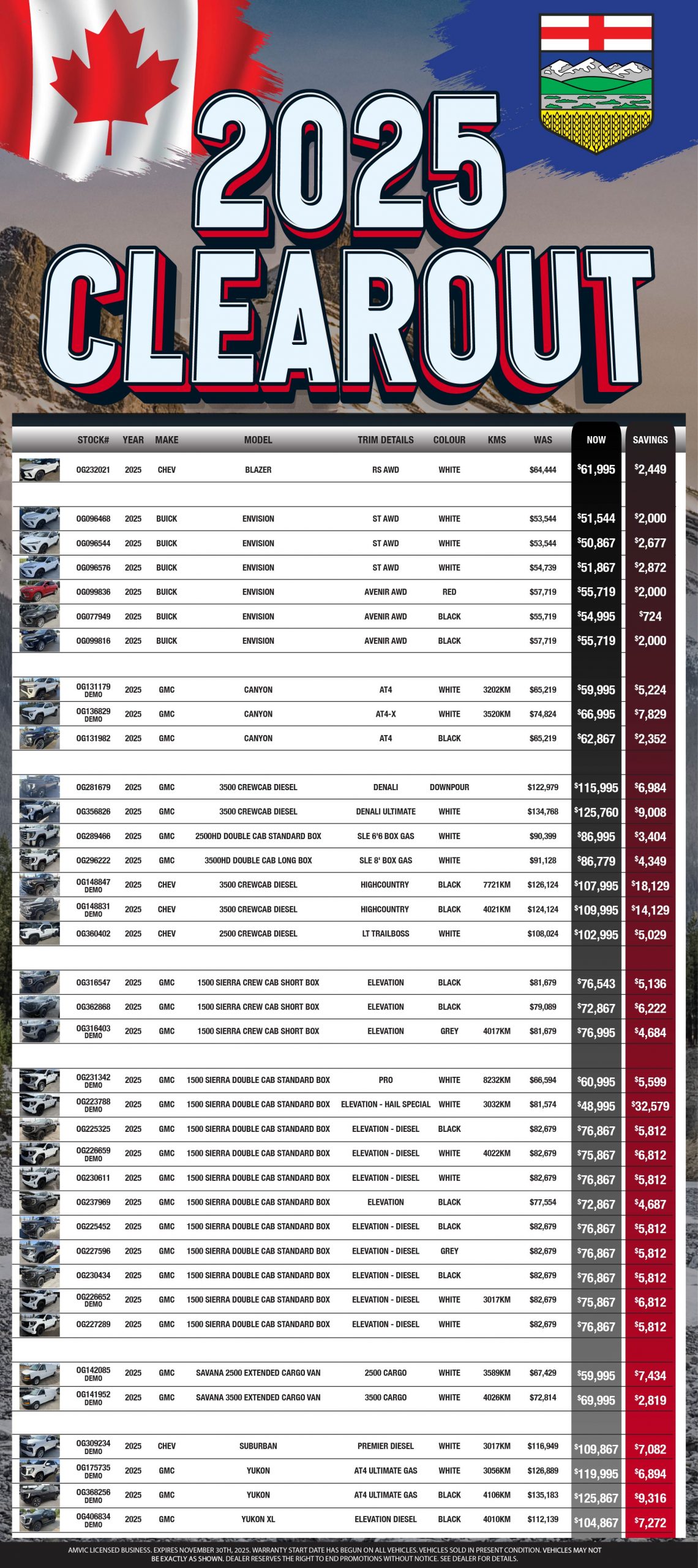 AMVIC LICENSED BUSINESS. EXPIRES NOVEMBER 30TH, 2025. WARRANTY START DATE HAS BEGUN ON ALL VEHICLES. VEHICLES SOLD IN PRESENT CONDITION. DEALER RESERVES THE RIGHT TO END PROMOTIONS WITHOUT NOTICE. SEE DEALER FOR DETAILS.